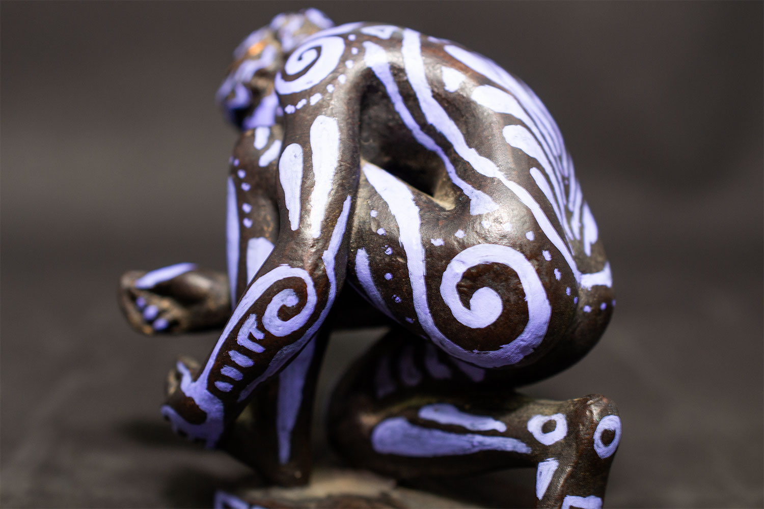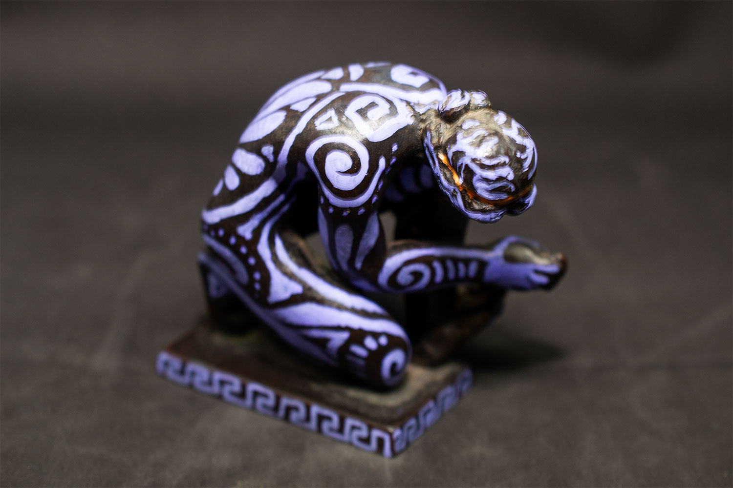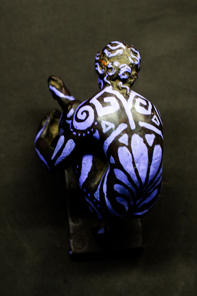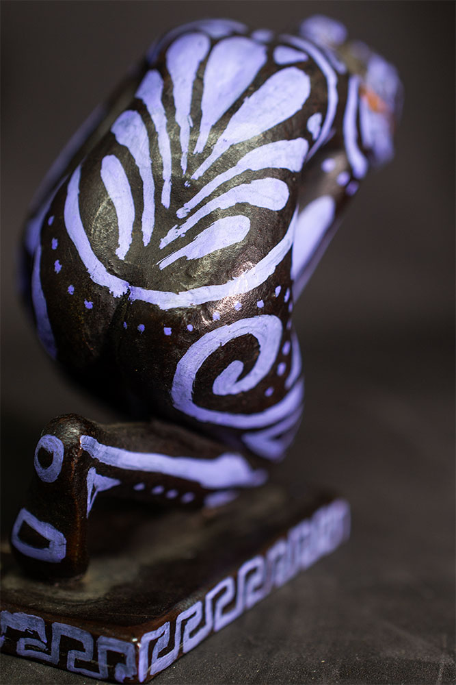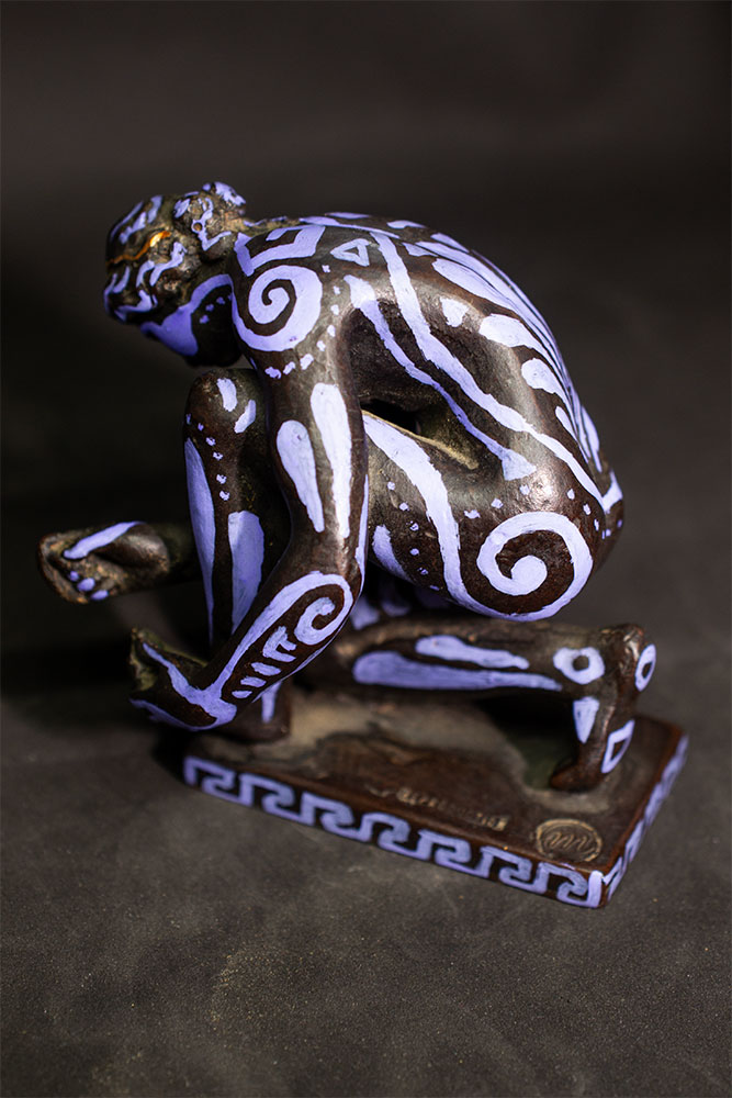 Figurine féminine agenouillée, L’Implorante de Lysandre incarne la force contenue et la vulnérabilité sacrée des anciennes prêtresses. Son corps, presque entièrement courbé en offrande, est recouvert de motifs greco-romains revisités : spirales protectrices, lignes ondoyantes rappelant les fresques minoennes, et frises labyrinthiques qui courent le long du socle.