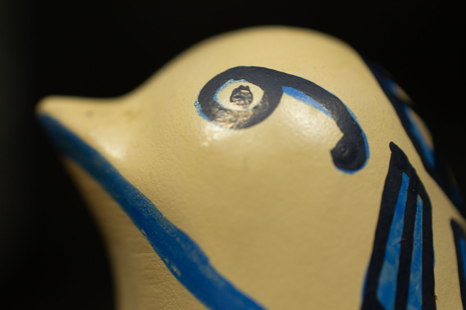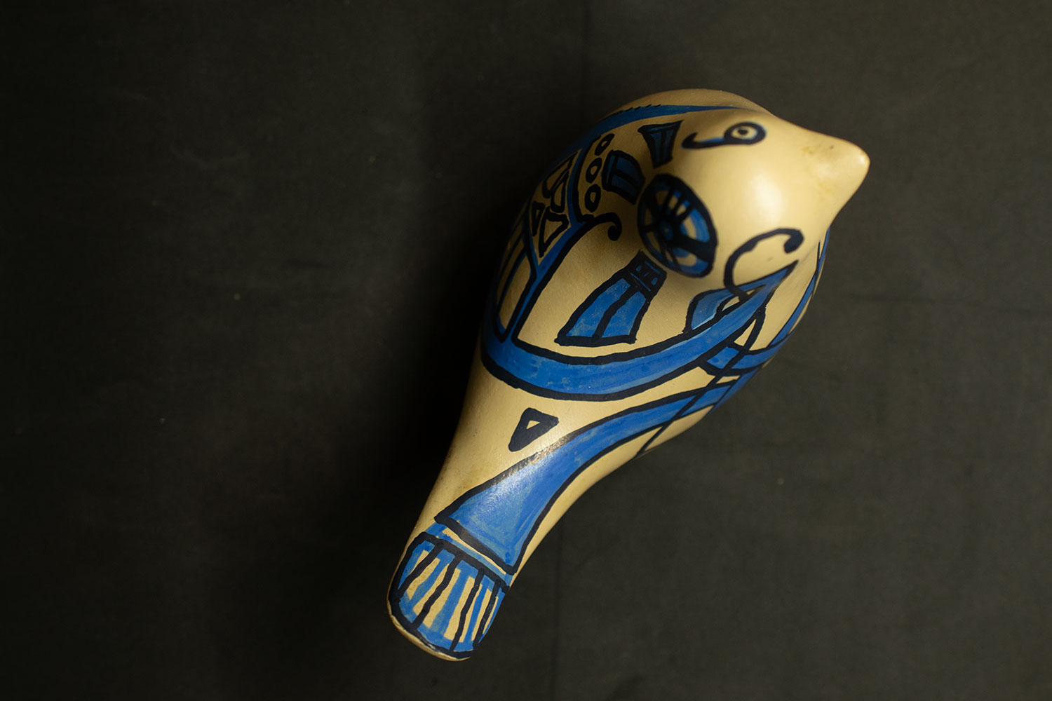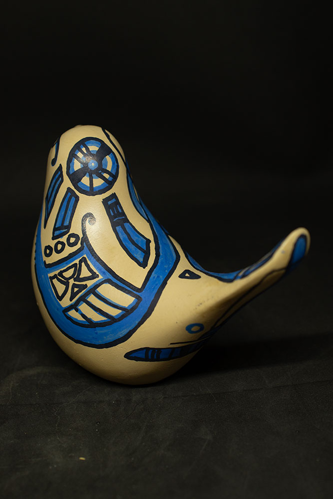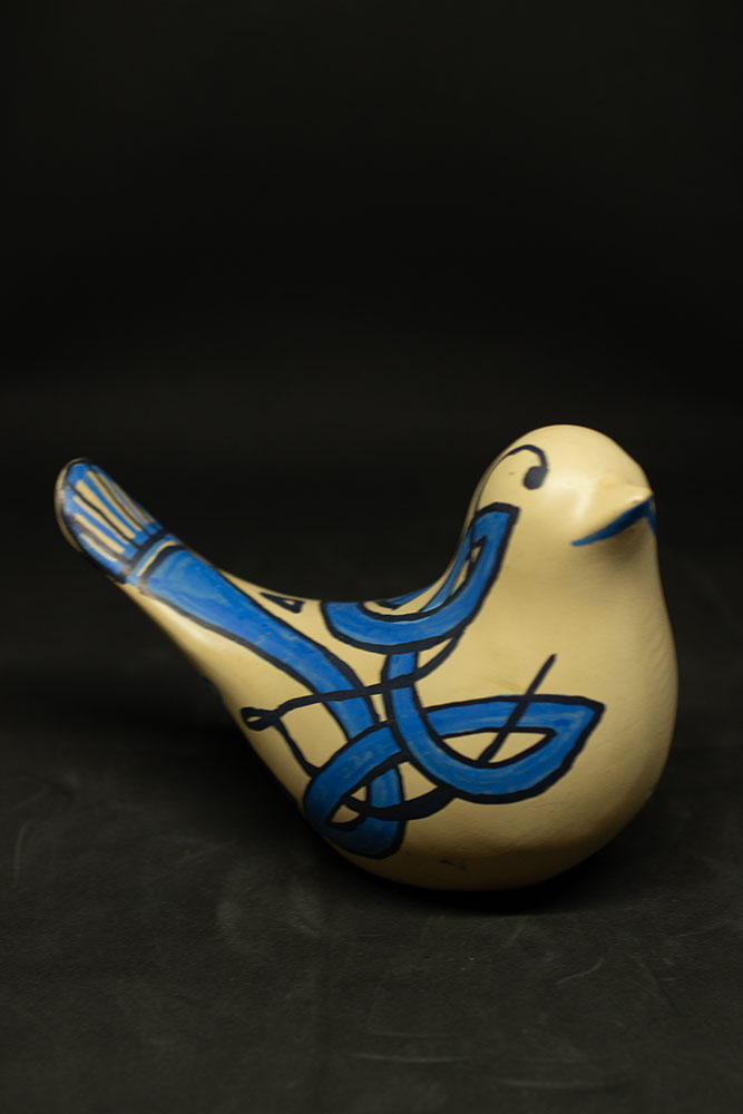 Son unique œil ouvert n’est pas un manque : c’est un regard concentré, tourné vers l’essentiel. Comme les anciens motifs celtes aux lignes fluides et symboliques, Vivacitas parle de renaissance, de lien, de fluidité naturelle. Son plumage beige est celui de l’écorce, du sable ou de la laine brute, tandis que ses motifs bleus dessinent un monde intérieur, sensible et ancien — un écho aux teintures végétales et à la sagesse des gestes simples.